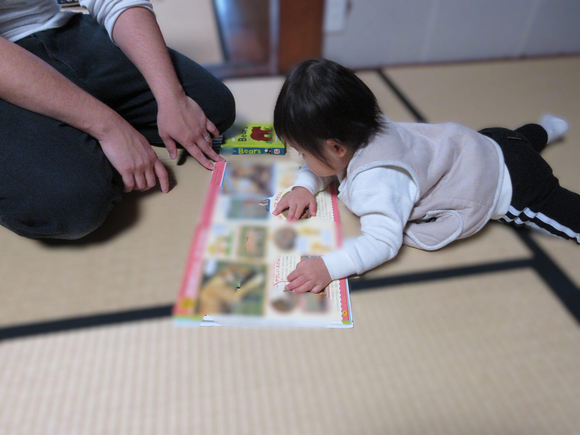 身振り手振りで絵本を見ていますよ。